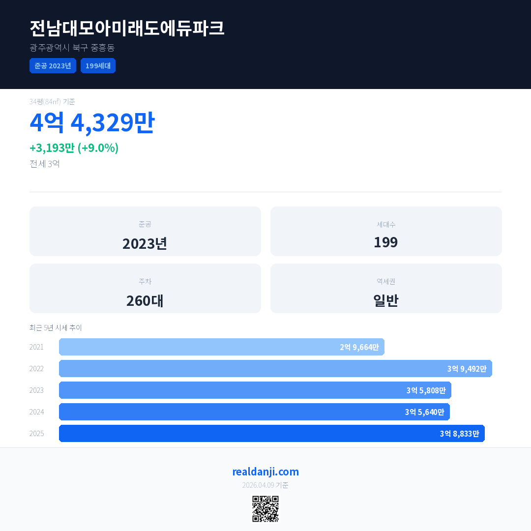 전남대모아미래도에듀파크 최근 거래가는 4억 4,329만입니다. (2025-12)