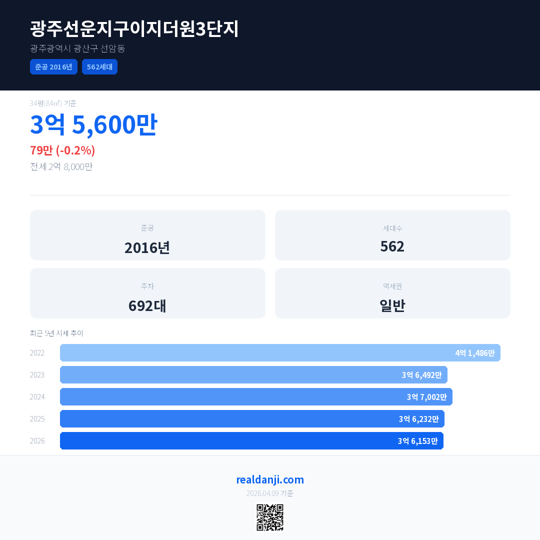 광주선운지구이지더원3단지은(는) 2016년에 준공되었으며, 현재 10년차입니다. 총 562세대 규모입니다.