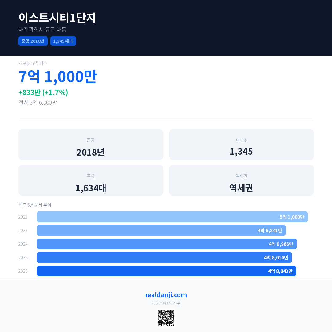 이스트시티1단지 국민평형 기준 2026년 평균 거래가는 4억 8,843만으로, 전년 대비 1.7% 상승 했습니다.