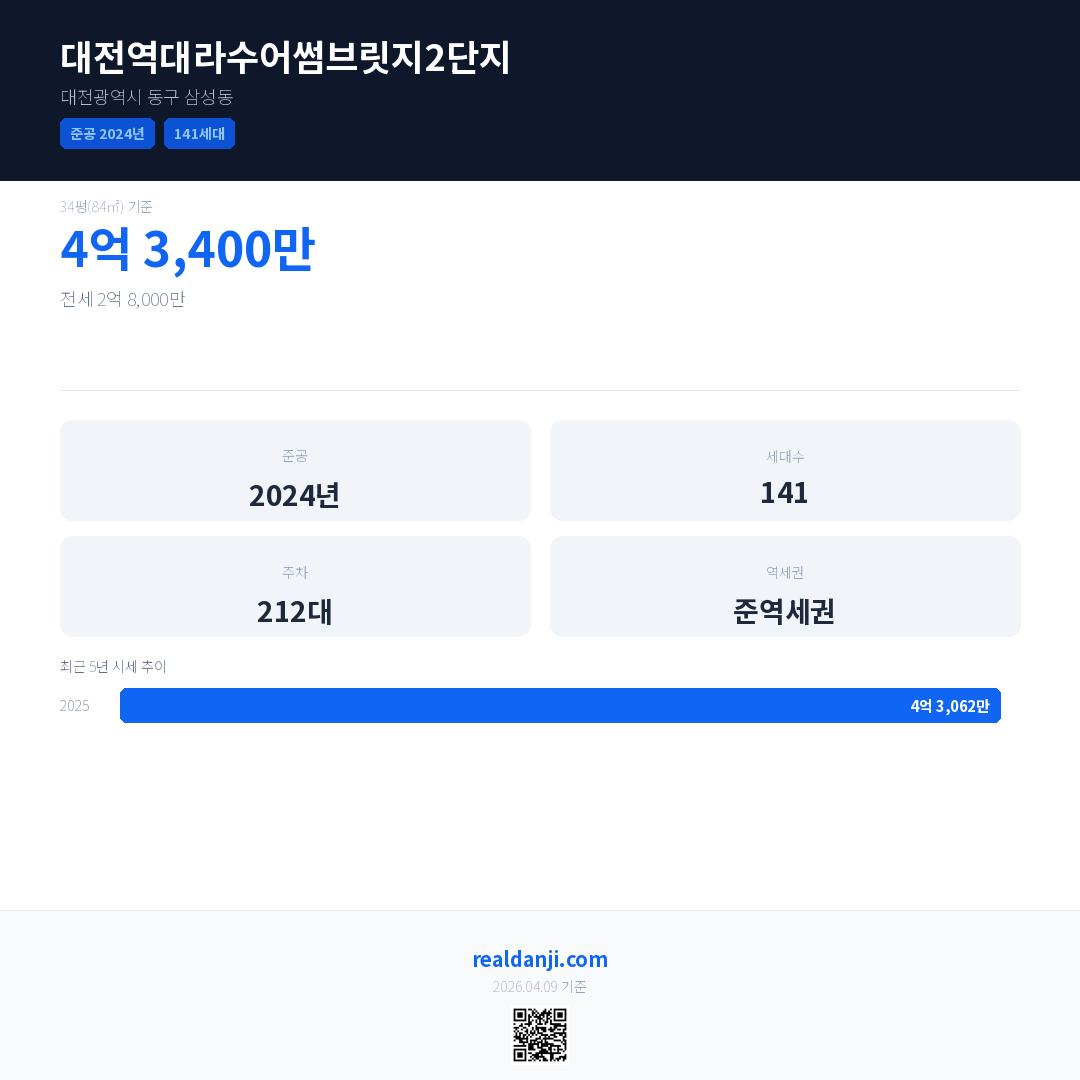 대전역대라수어썸브릿지2단지 최근 거래가는 4억 3,400만입니다. (2025-10)