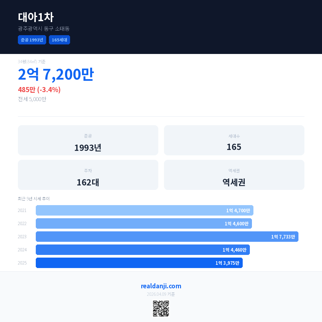 대아1차 국민평형 기준 2025년 평균 거래가는 1억 3,975만으로, 전년 대비 3.4% 하락 했습니다.
