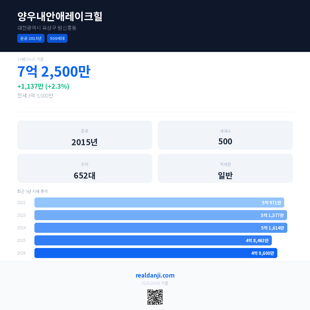 양우내안애레이크힐 국민평형 기준 2026년 평균 거래가는 4억 9,600만으로, 전년 대비 2.3% 상승 했습니다.