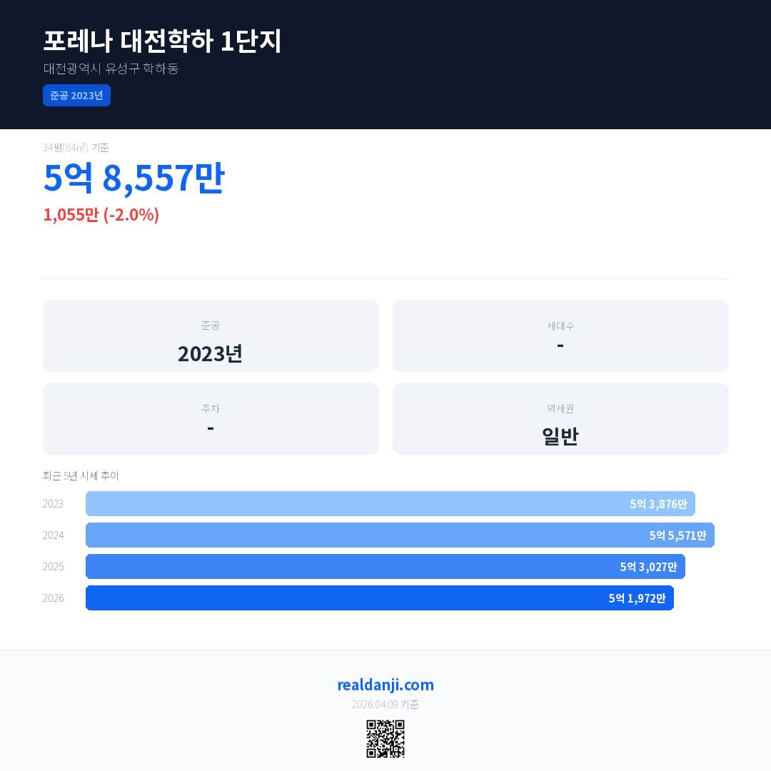 포레나 대전학하 1단지 국민평형 기준 2026년 평균 거래가는 5억 1,972만으로, 전년 대비 2.0% 하락 했습니다.