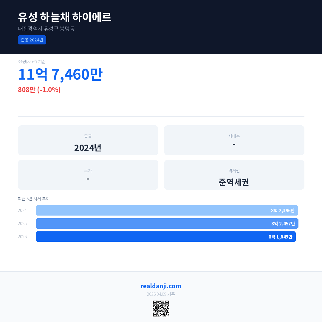 유성 하늘채 하이에르 국민평형 기준 2026년 평균 거래가는 8억 1,649만으로, 전년 대비 1.0% 하락 했습니다.