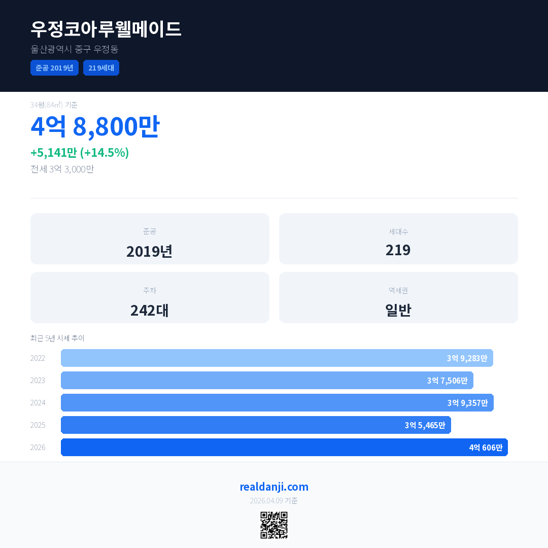 우정코아루웰메이드 국민평형 기준 2026년 평균 거래가는 4억 606만으로, 전년 대비 14.5% 상승 했습니다.