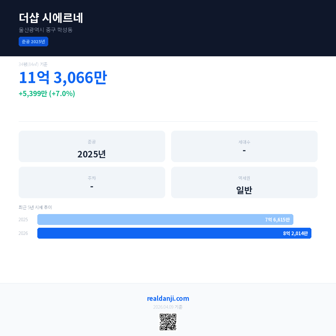 더샵 시에르네 국민평형 기준 2026년 평균 거래가는 8억 2,014만으로, 전년 대비 7.0% 상승 했습니다.