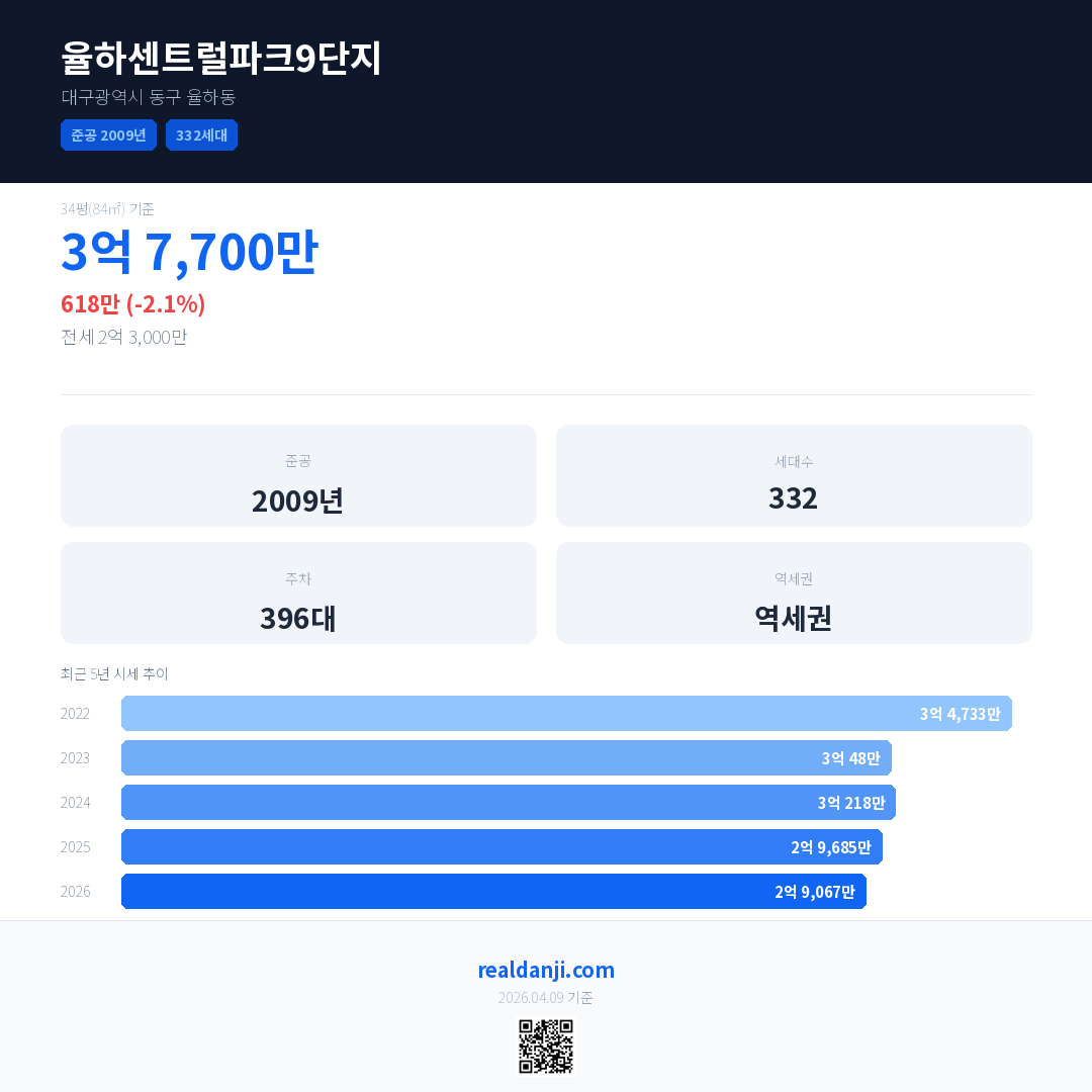 율하센트럴파크9단지 최근 거래가는 3억 7,700만입니다. (2026-02)