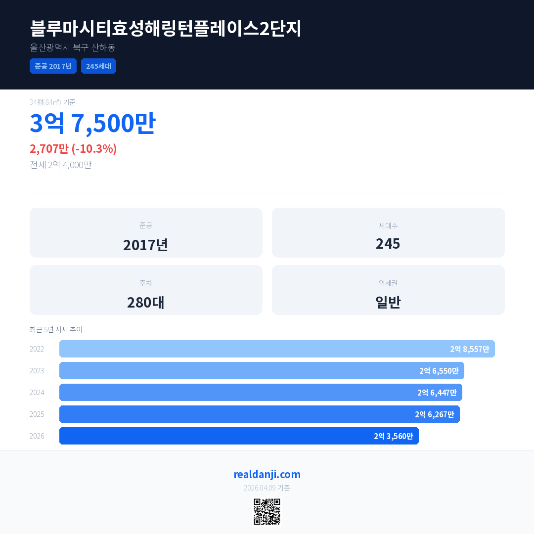 블루마시티효성해링턴플레이스2단지 최근 거래가는 3억 7,500만입니다. (2026-02)