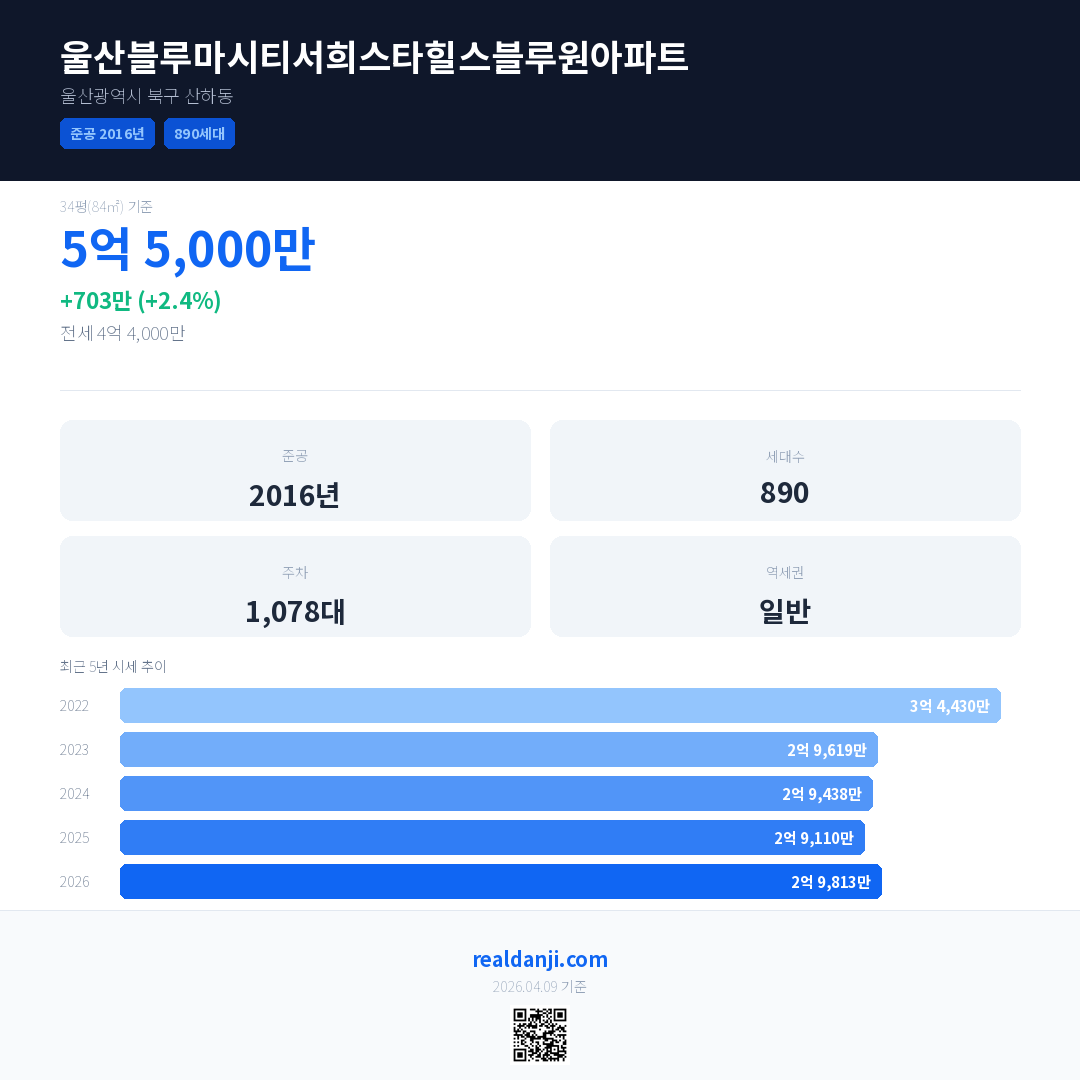 울산블루마시티서희스타힐스블루원아파트 국민평형 기준 2026년 평균 거래가는 2억 9,813만으로, 전년 대비 2.4% 상승 했습니다.