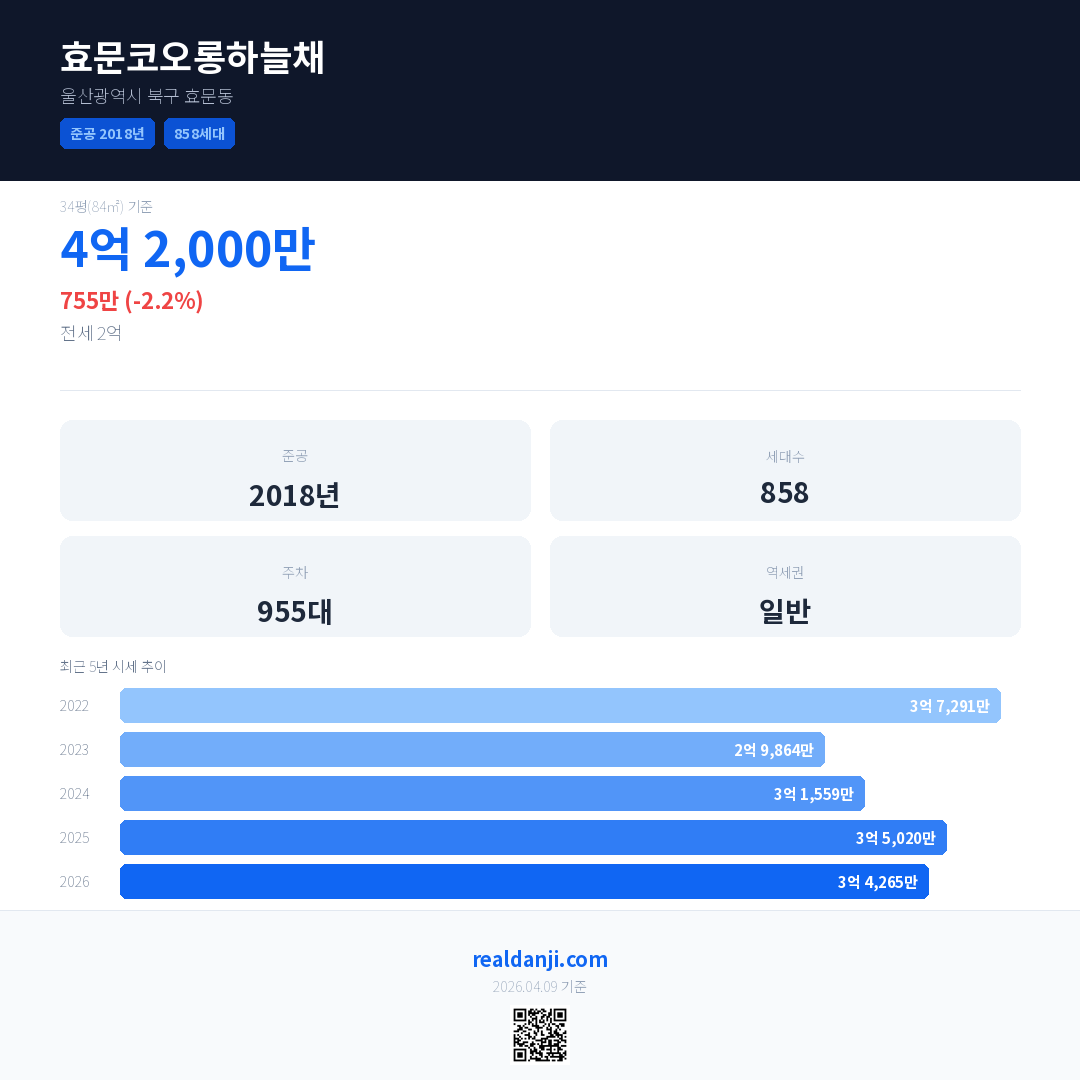 효문코오롱하늘채 최근 거래가는 4억 2,000만입니다. (2026-04)