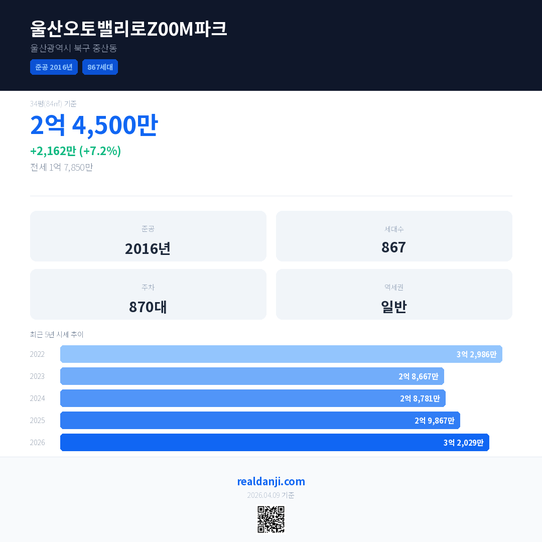 울산오토밸리로Z00M파크은(는) 2016년에 준공되었으며, 현재 10년차입니다. 총 867세대 규모입니다.