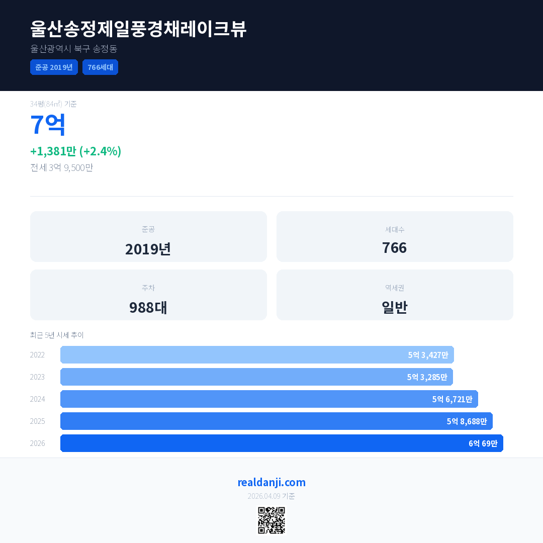 울산송정제일풍경채레이크뷰 국민평형 기준 2026년 평균 거래가는 6억 69만으로, 전년 대비 2.4% 상승 했습니다.