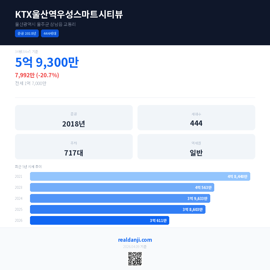 KTX울산역우성스마트시티뷰 최근 거래가는 5억 9,300만입니다. (2026-03)