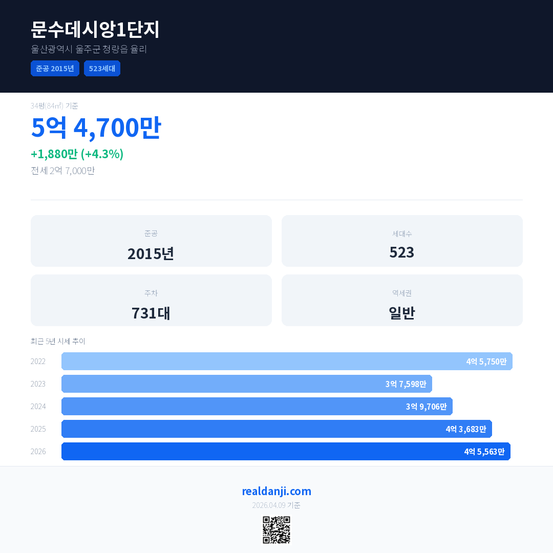 문수데시앙1단지 국민평형 기준 2026년 평균 거래가는 4억 5,563만으로, 전년 대비 4.3% 상승 했습니다.