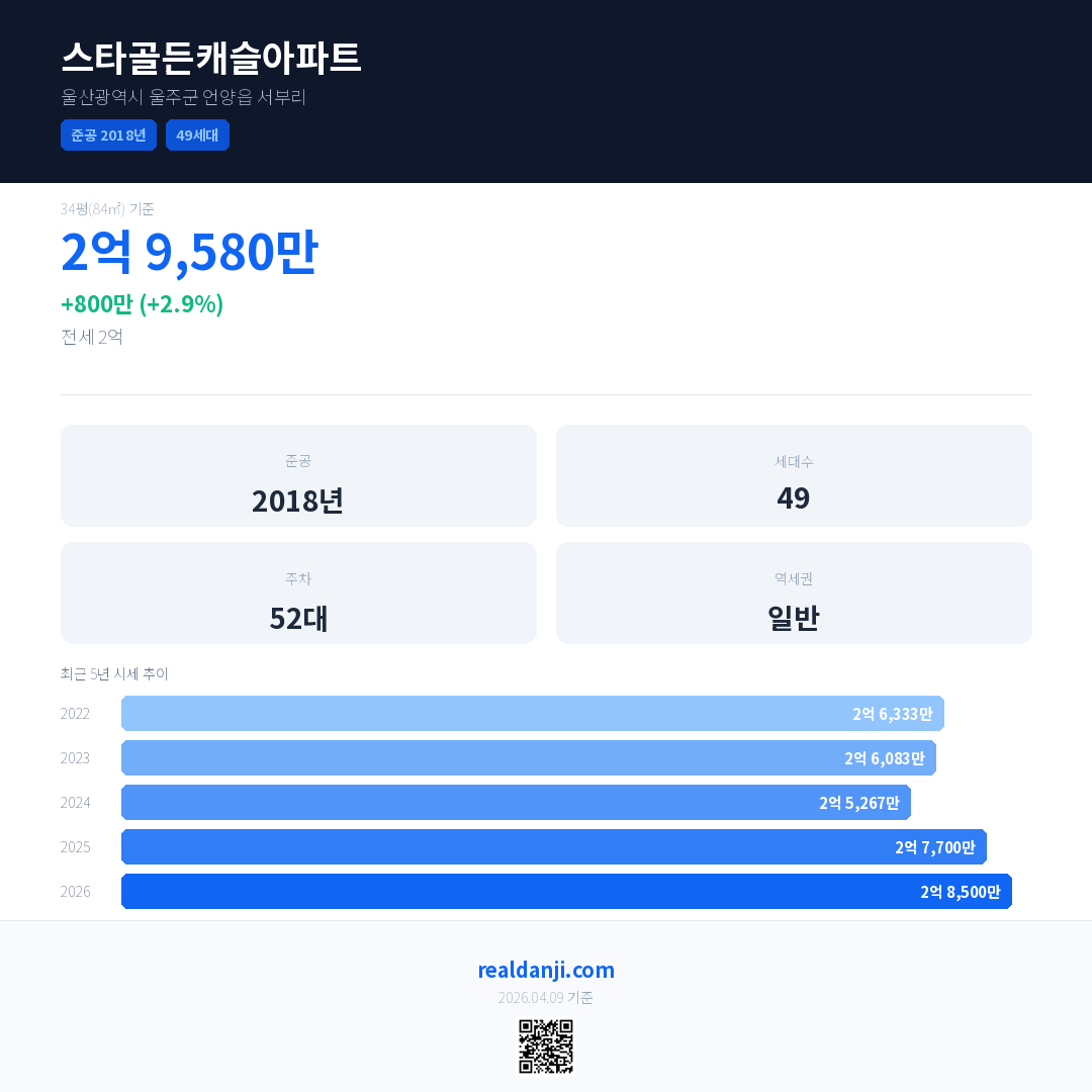 스타골든캐슬아파트 국민평형 기준 2026년 평균 거래가는 2억 8,500만으로, 전년 대비 2.9% 상승 했습니다.