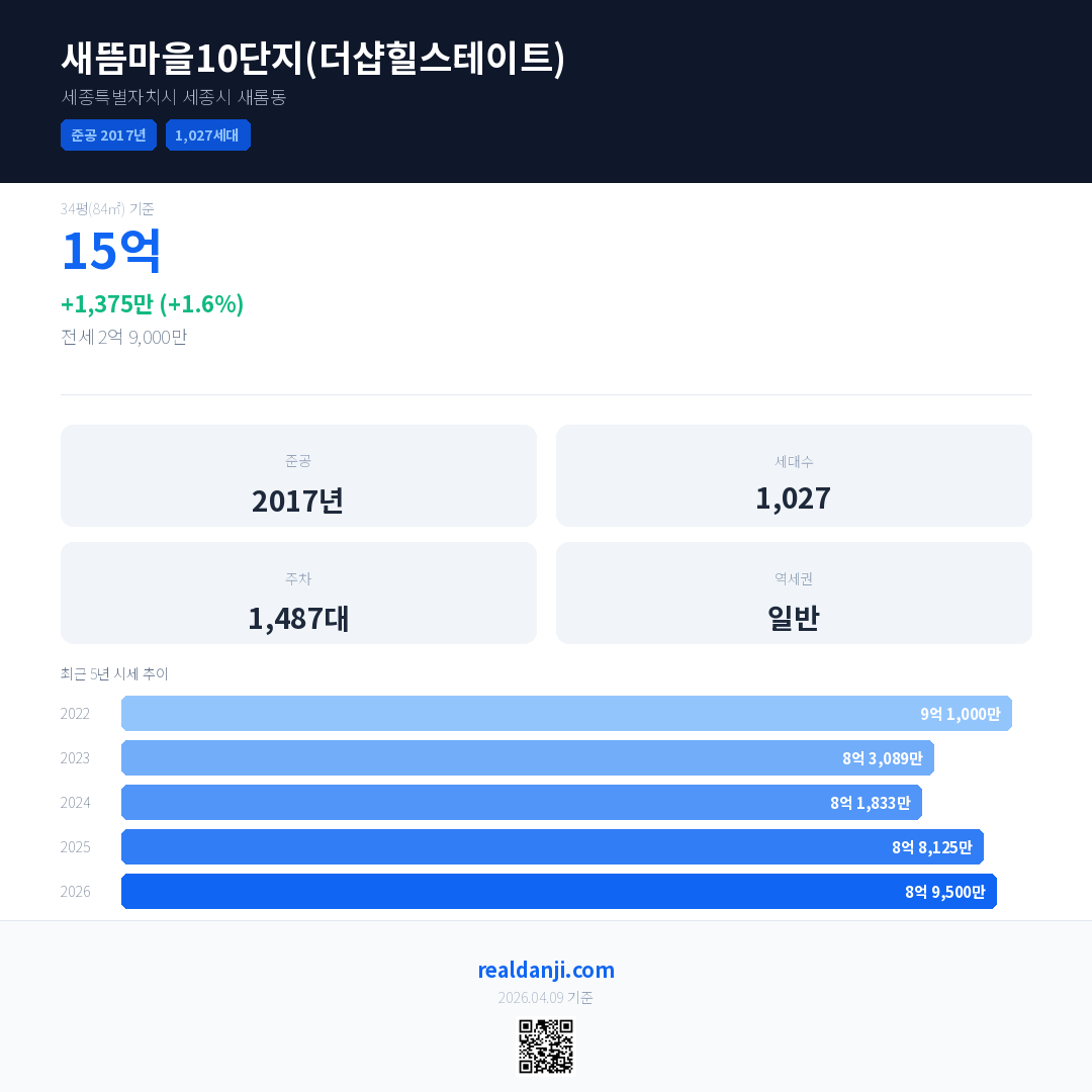 새뜸마을10단지(더샵힐스테이트) 국민평형 기준 2026년 평균 거래가는 8억 9,500만으로, 전년 대비 1.6% 상승 했습니다.