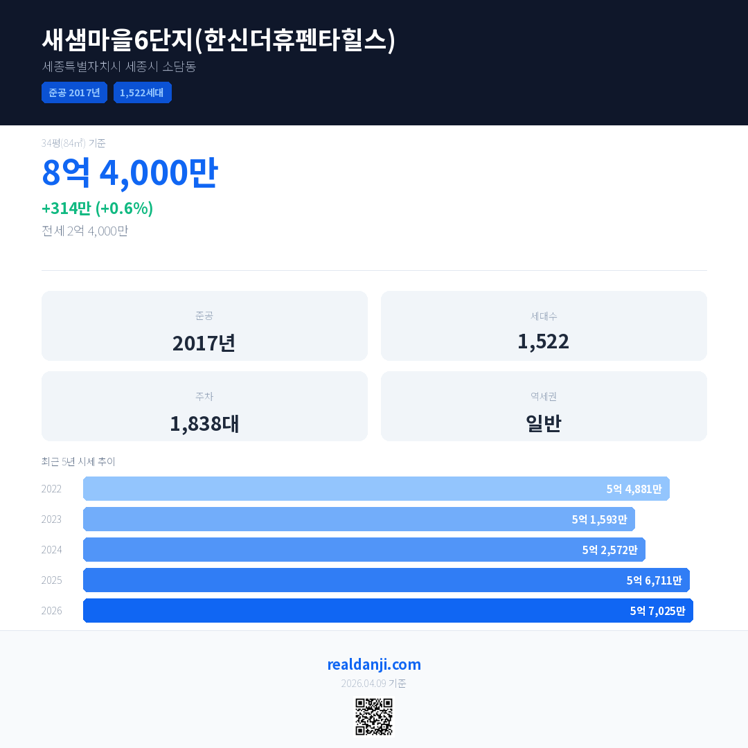 새샘마을6단지(한신더휴펜타힐스) 국민평형 기준 2026년 평균 거래가는 5억 7,025만으로, 전년 대비 0.6% 상승 했습니다.
