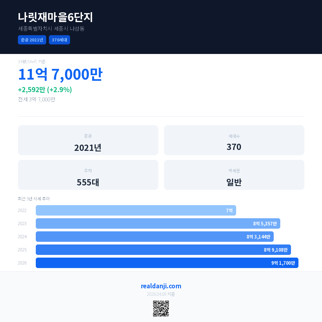 나릿재마을6단지 국민평형 기준 2026년 평균 거래가는 9억 1,700만으로, 전년 대비 2.9% 상승 했습니다.