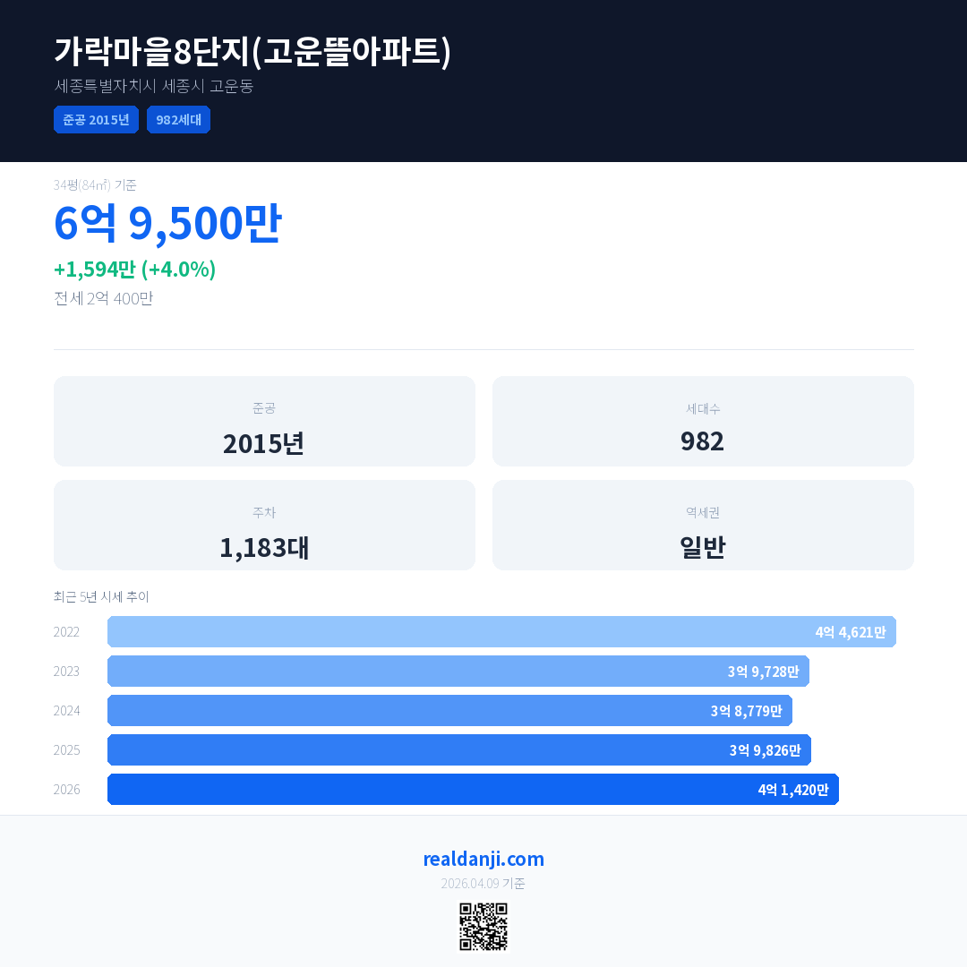 가락마을8단지(고운뜰아파트) 최근 거래가는 6억 9,500만입니다. (2026-04)