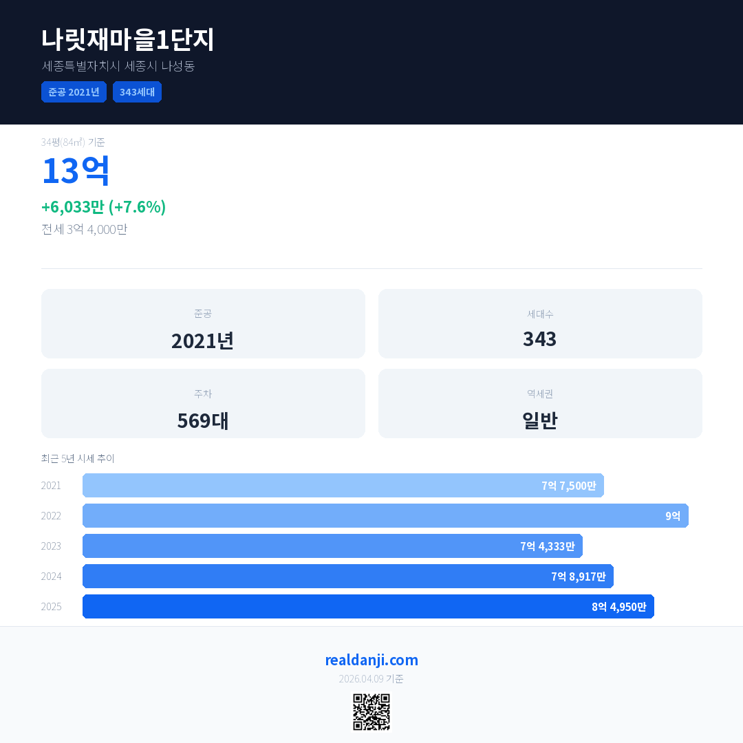 나릿재마을1단지 최근 거래가는 13억입니다. (2026-02)