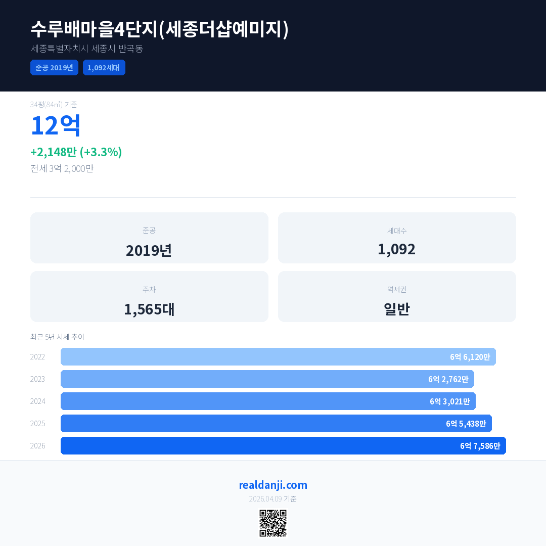 수루배마을4단지(세종더샵예미지) 국민평형 기준 2026년 평균 거래가는 6억 7,586만으로, 전년 대비 3.3% 상승 했습니다.