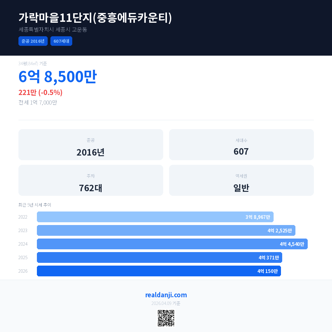 가락마을11단지(중흥에듀카운티) 국민평형 기준 2026년 평균 거래가는 4억 150만으로, 전년 대비 0.5% 하락 했습니다.