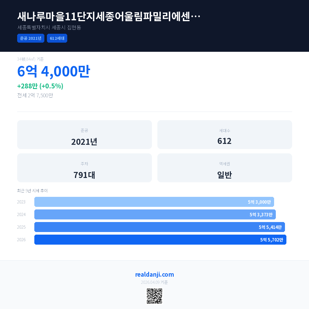 새나루마을11단지세종어울림파밀리에센트럴 국민평형 기준 2026년 평균 거래가는 5억 5,702만으로, 전년 대비 0.5% 상승 했습니다.