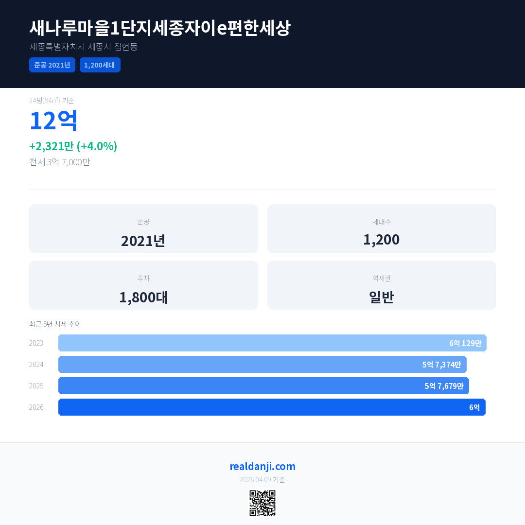 새나루마을1단지세종자이e편한세상 최근 거래가는 12억입니다. (2026-03)