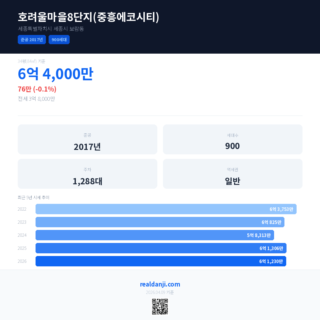 호려울마을8단지(중흥에코시티) 국민평형 기준 2026년 평균 거래가는 6억 1,230만으로, 전년 대비 0.1% 하락 했습니다.