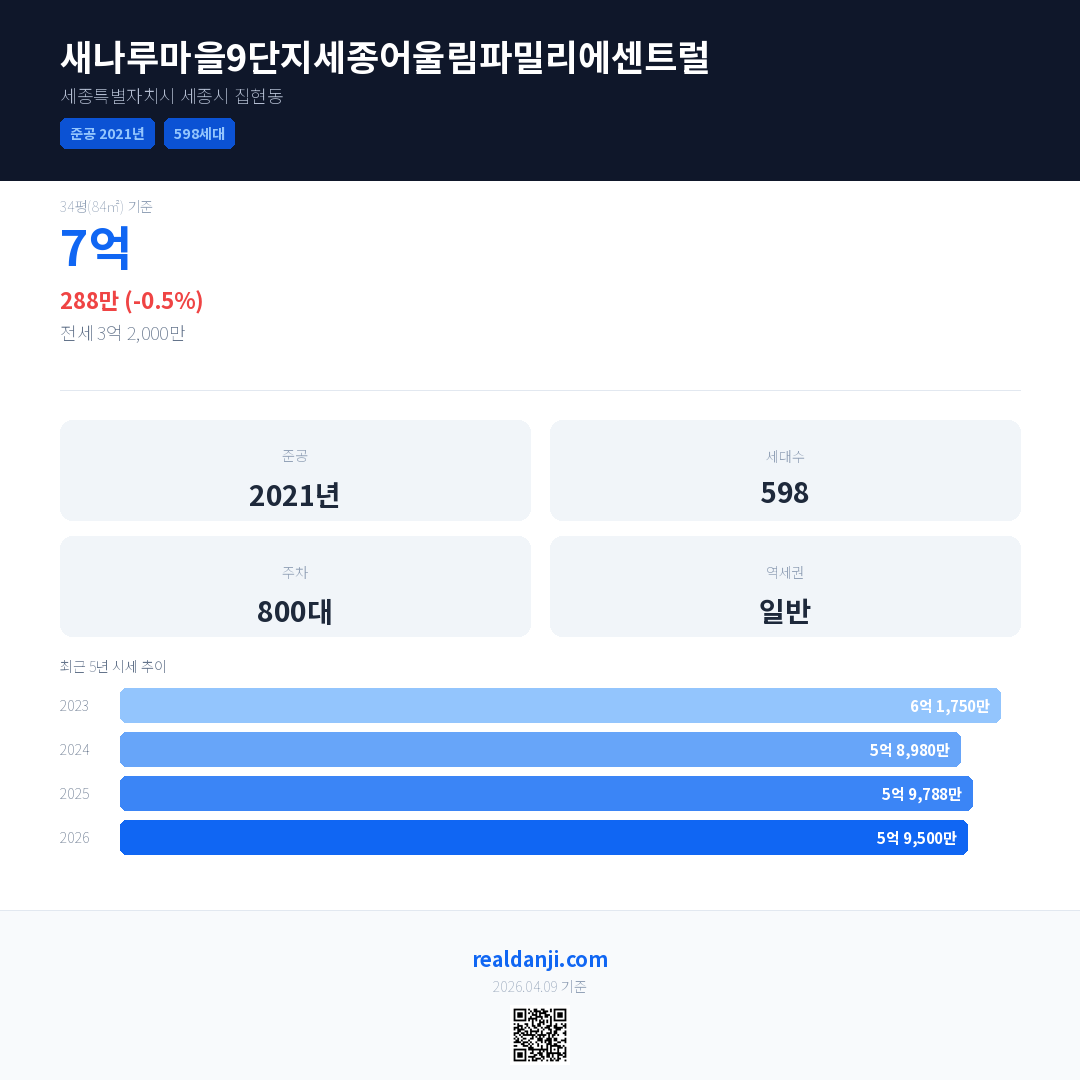 새나루마을9단지세종어울림파밀리에센트럴 국민평형 기준 2026년 평균 거래가는 5억 9,500만으로, 전년 대비 0.5% 하락 했습니다.