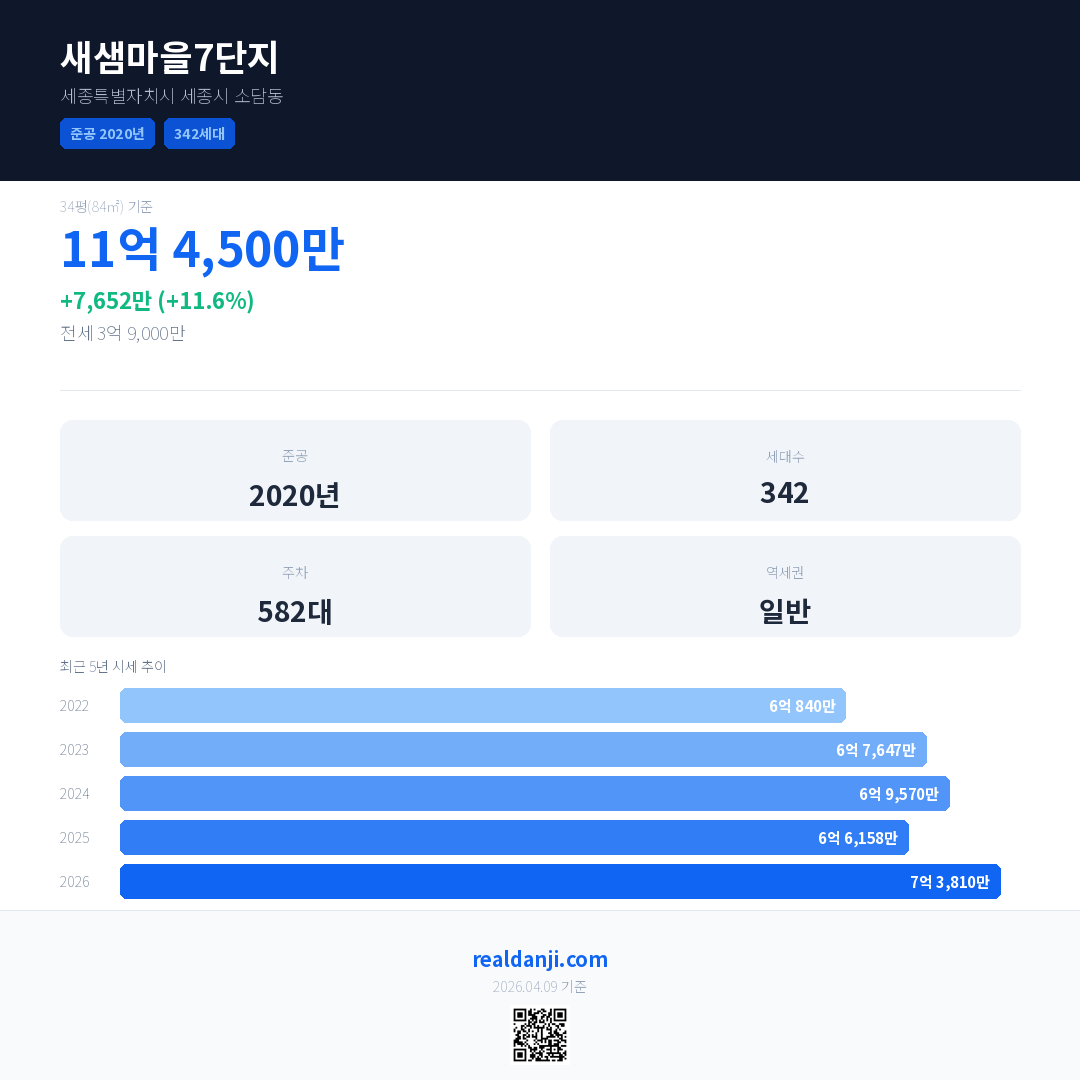 새샘마을7단지 국민평형 기준 2026년 평균 거래가는 7억 3,810만으로, 전년 대비 11.6% 상승 했습니다.