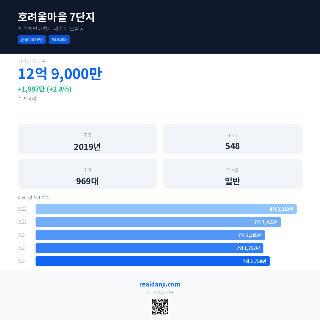 호려울마을 7단지 국민평형 기준 2026년 평균 거래가는 7억 3,750만으로, 전년 대비 2.8% 상승 했습니다.