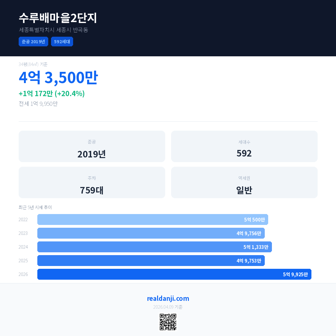 수루배마을2단지 국민평형 기준 2026년 평균 거래가는 5억 9,925만으로, 전년 대비 20.4% 상승 했습니다.