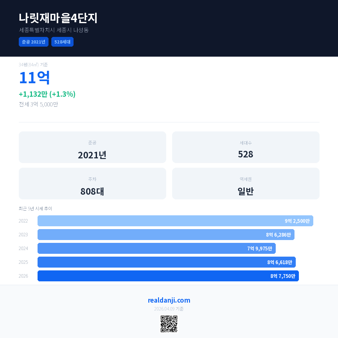 나릿재마을4단지 국민평형 기준 2026년 평균 거래가는 8억 7,750만으로, 전년 대비 1.3% 상승 했습니다.