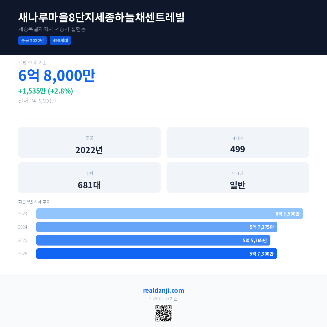 새나루마을8단지세종하늘채센트레빌 국민평형 기준 2026년 평균 거래가는 5억 7,300만으로, 전년 대비 2.8% 상승 했습니다.