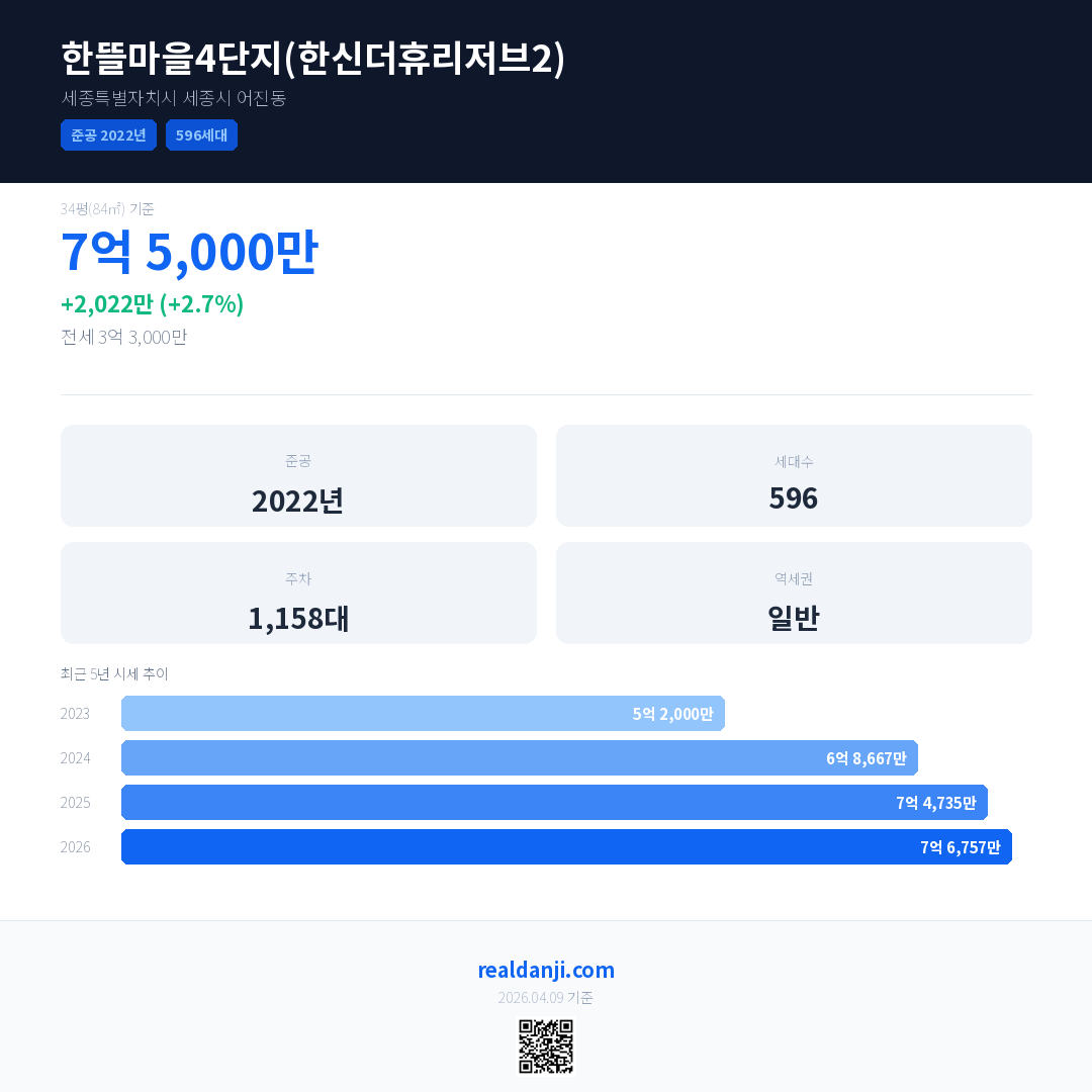 한뜰마을4단지(한신더휴리저브2)은(는) 2022년에 준공되었으며, 현재 4년차입니다. 총 596세대 규모입니다.