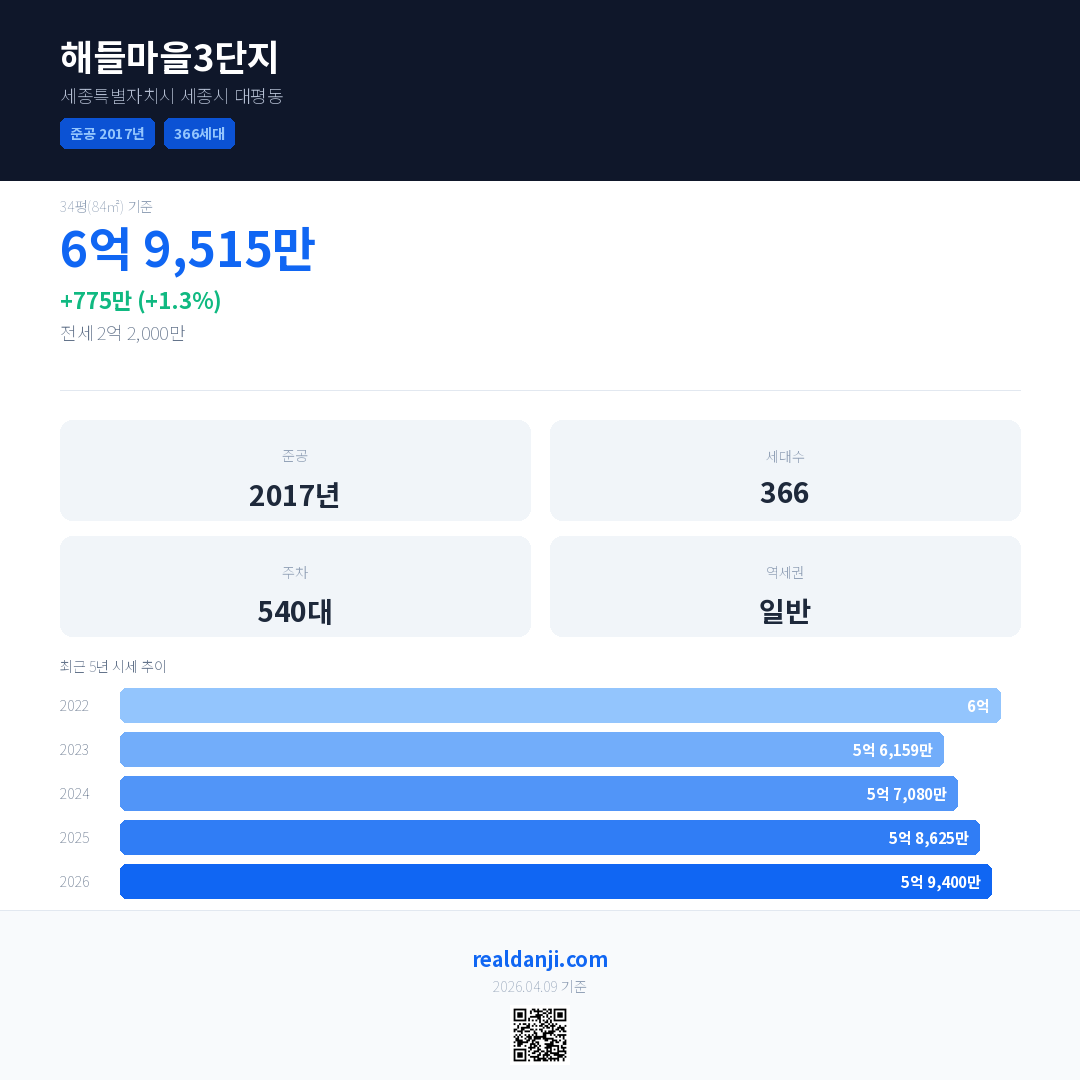 해들마을3단지 국민평형 기준 2026년 평균 거래가는 5억 9,400만으로, 전년 대비 1.3% 상승 했습니다.