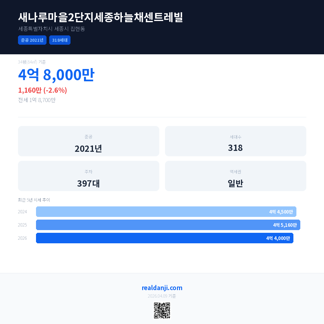 새나루마을2단지세종하늘채센트레빌 국민평형 기준 2026년 평균 거래가는 4억 4,000만으로, 전년 대비 2.6% 하락 했습니다.