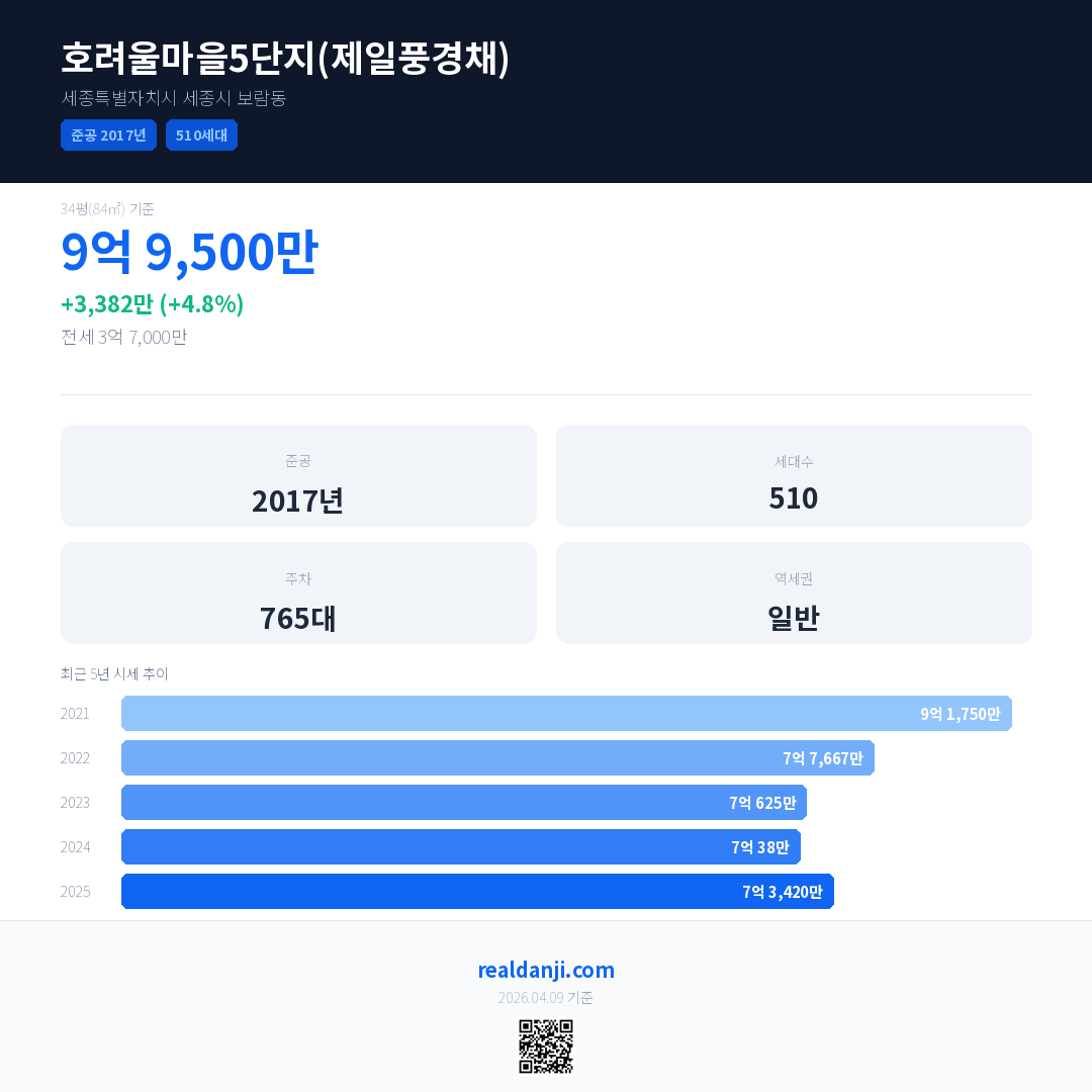 호려울마을5단지(제일풍경채) 최근 거래가는 9억 9,500만입니다. (2025-12)