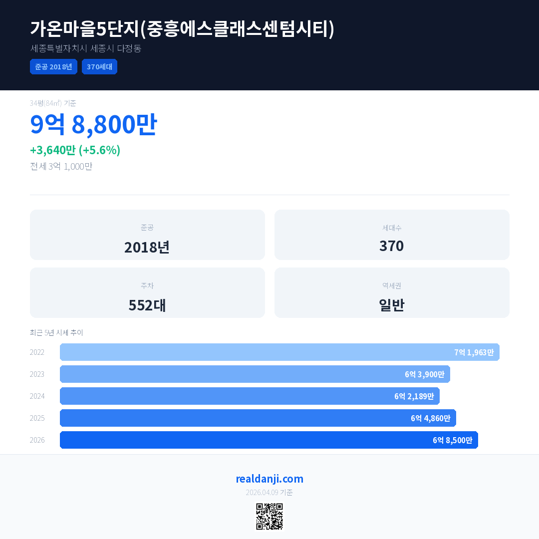 가온마을5단지(중흥에스클래스센텀시티)은(는) 2018년에 준공되었으며, 현재 8년차입니다. 총 370세대 규모입니다.