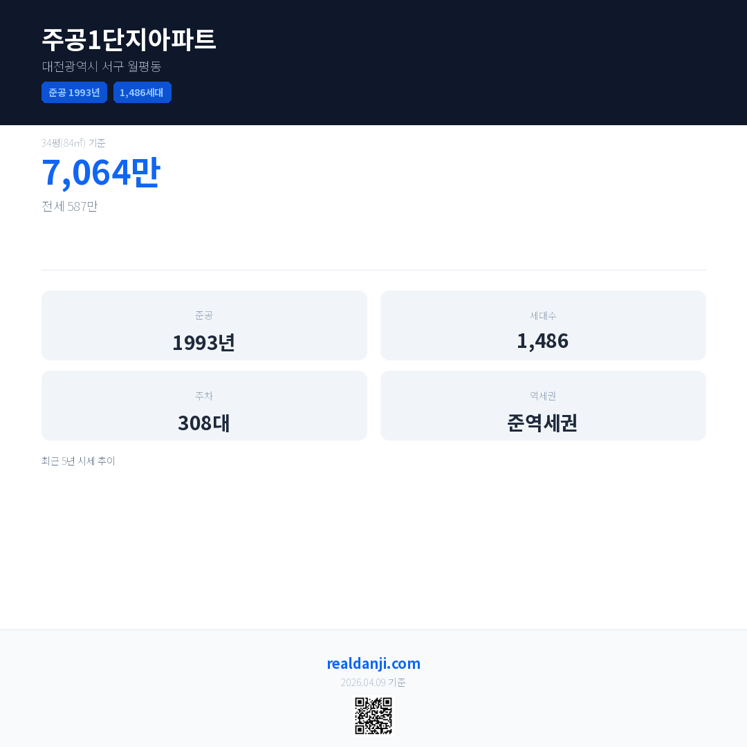 주공1단지아파트은(는) 1993년에 준공되었으며, 현재 33년차입니다. 총 1,486세대 규모입니다.