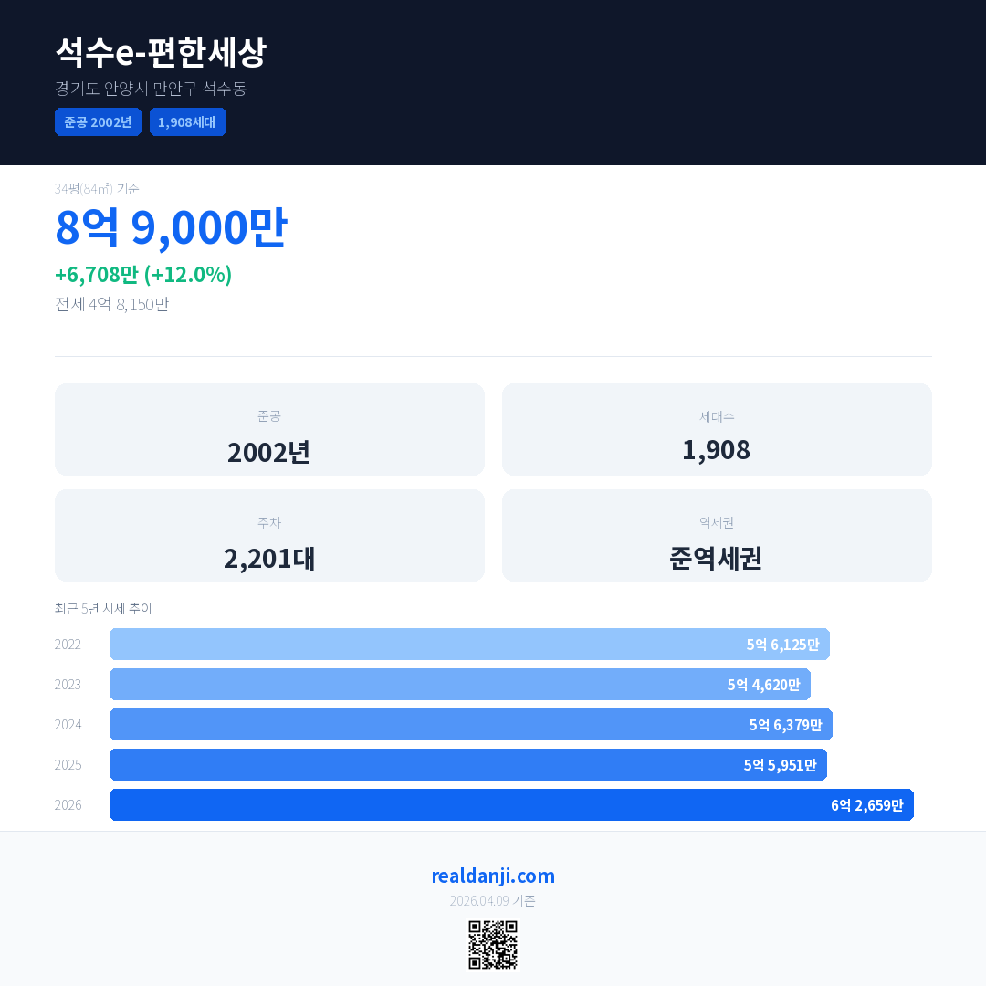 석수e-편한세상 최근 거래가는 8억 9,000만입니다. (2026-03)