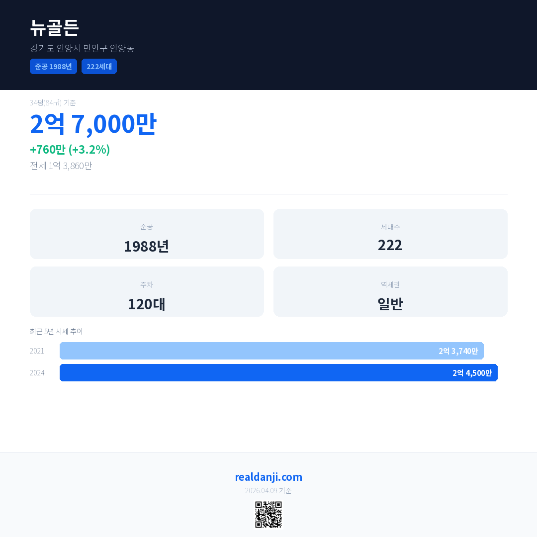 뉴골든 국민평형 기준 2024년 평균 거래가는 2억 4,500만으로, 전년 대비 3.2% 상승 했습니다.
