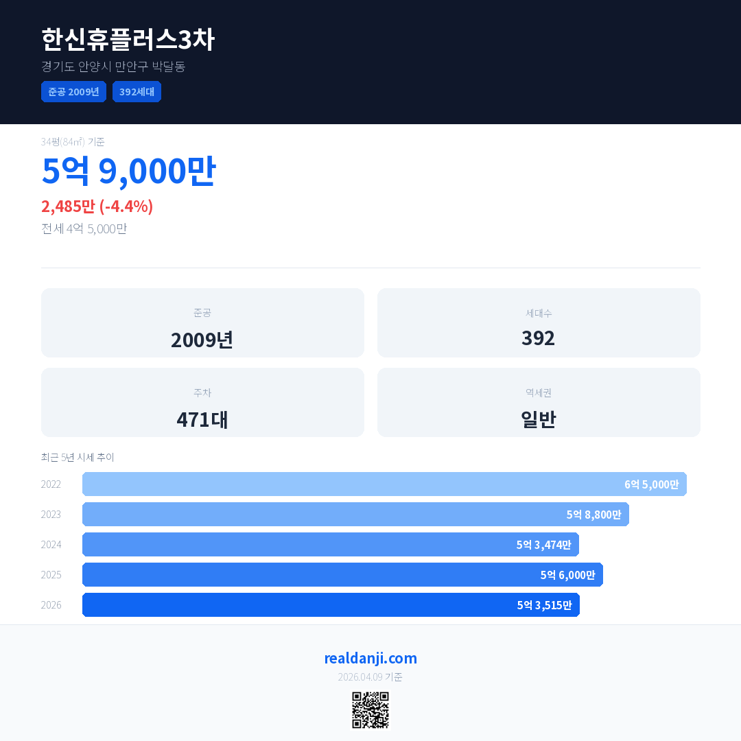 한신휴플러스3차 국민평형 기준 2026년 평균 거래가는 5억 3,515만으로, 전년 대비 4.4% 하락 했습니다.