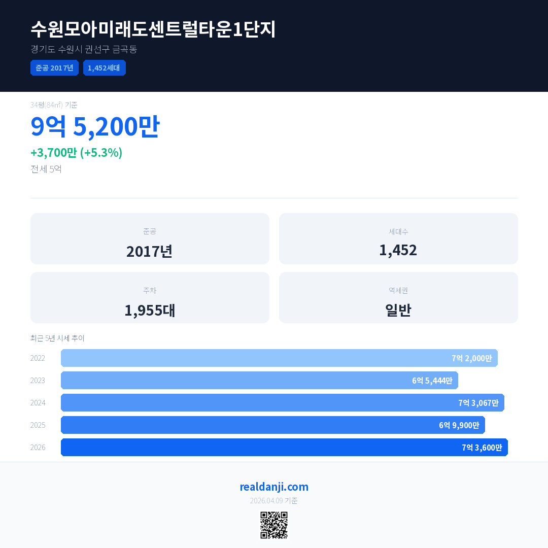 수원모아미래도센트럴타운1단지은(는) 2017년에 준공되었으며, 현재 9년차입니다. 총 1,452세대 규모입니다.