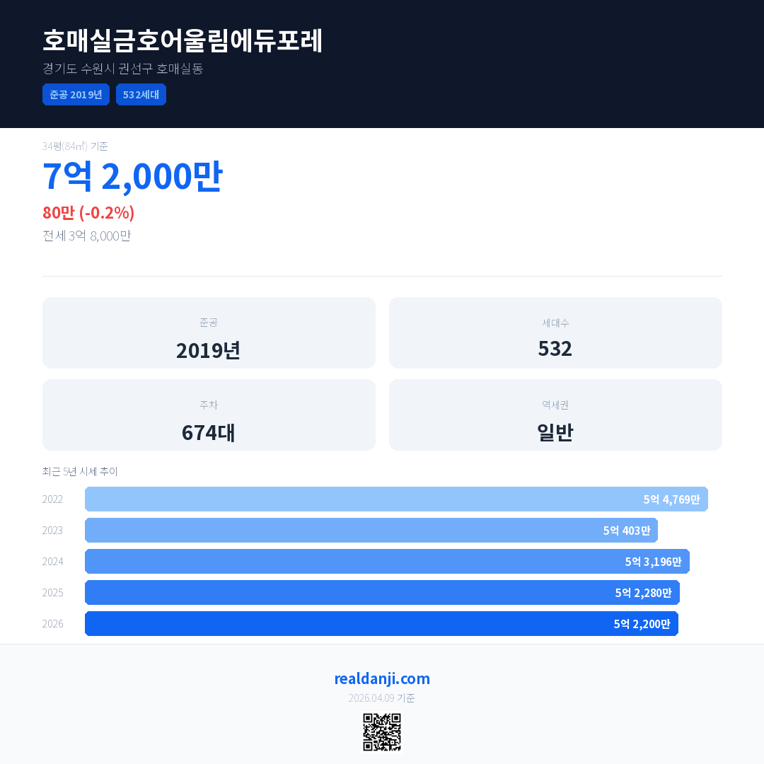 호매실금호어울림에듀포레 최근 거래가는 7억 2,000만입니다. (2026-04)