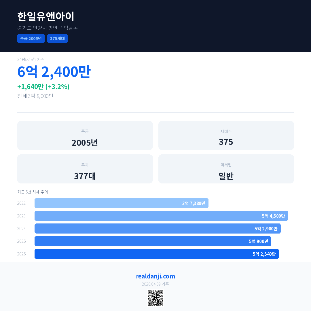 한일유앤아이 국민평형 기준 2026년 평균 거래가는 5억 2,540만으로, 전년 대비 3.2% 상승 했습니다.