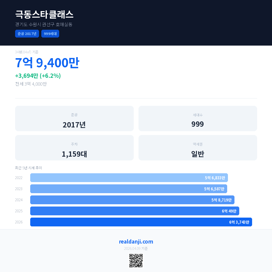 극동스타클래스 국민평형 기준 2026년 평균 거래가는 6억 3,743만으로, 전년 대비 6.2% 상승 했습니다.