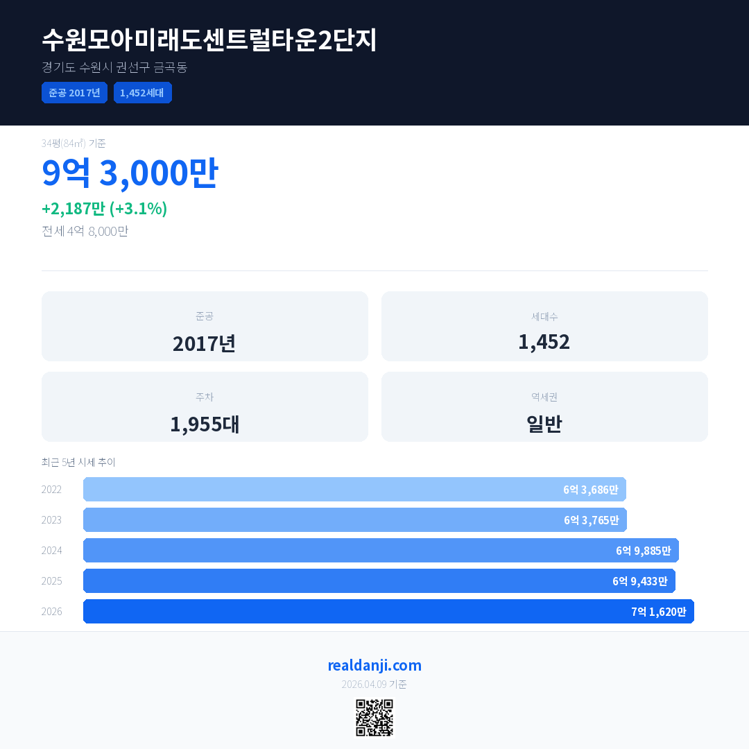 수원모아미래도센트럴타운2단지 국민평형 기준 2026년 평균 거래가는 7억 1,620만으로, 전년 대비 3.1% 상승 했습니다.
