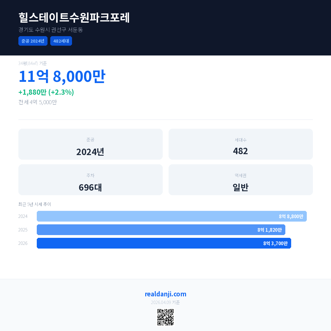 힐스테이트수원파크포레 국민평형 기준 2026년 평균 거래가는 8억 3,700만으로, 전년 대비 2.3% 상승 했습니다.
